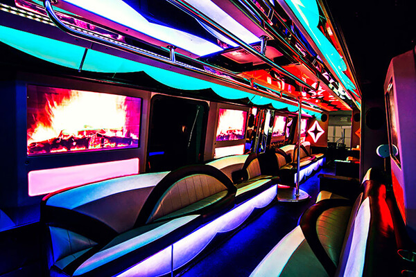 This 30 passenger limousine bus is so much more than you'd ever imagine a bus could be! Dark hardwood flooring is the perfect accent to the sultry mood lighting system, and our leather seating just encompasses you in comfort. Add in the HUGE high definition televisions and the audio system, and you have a complete package. Don't forget about our bars with granite topped counters!